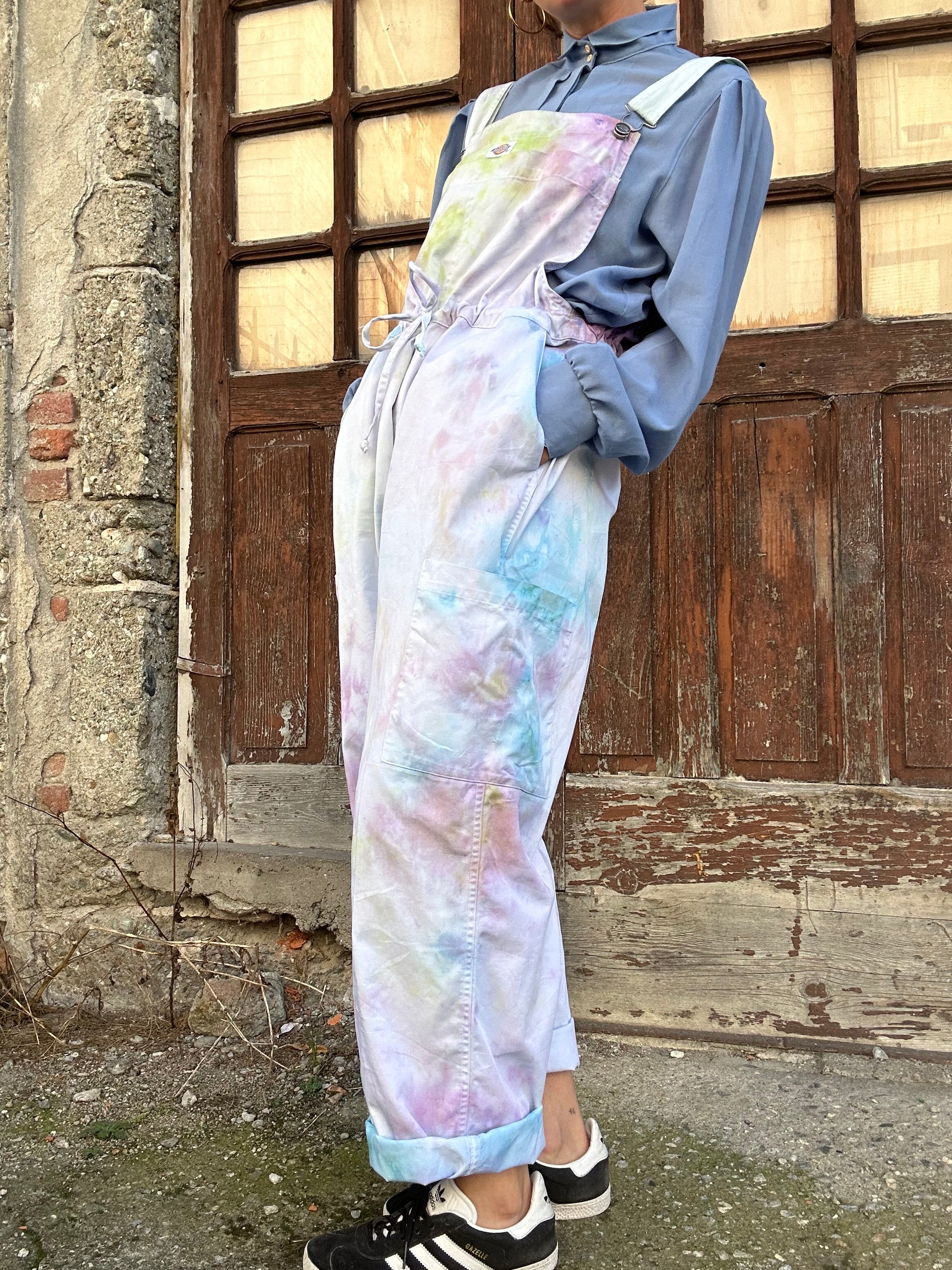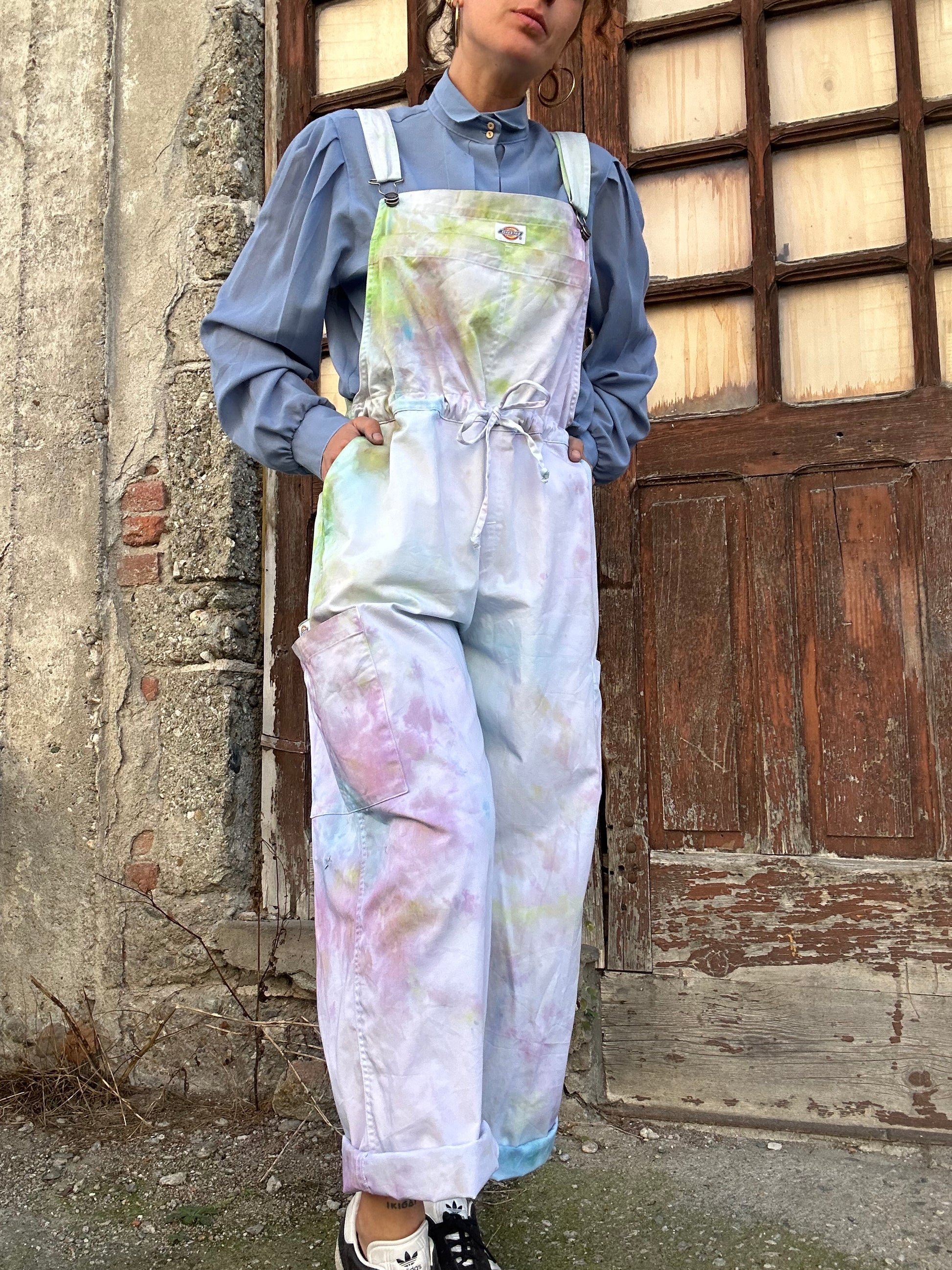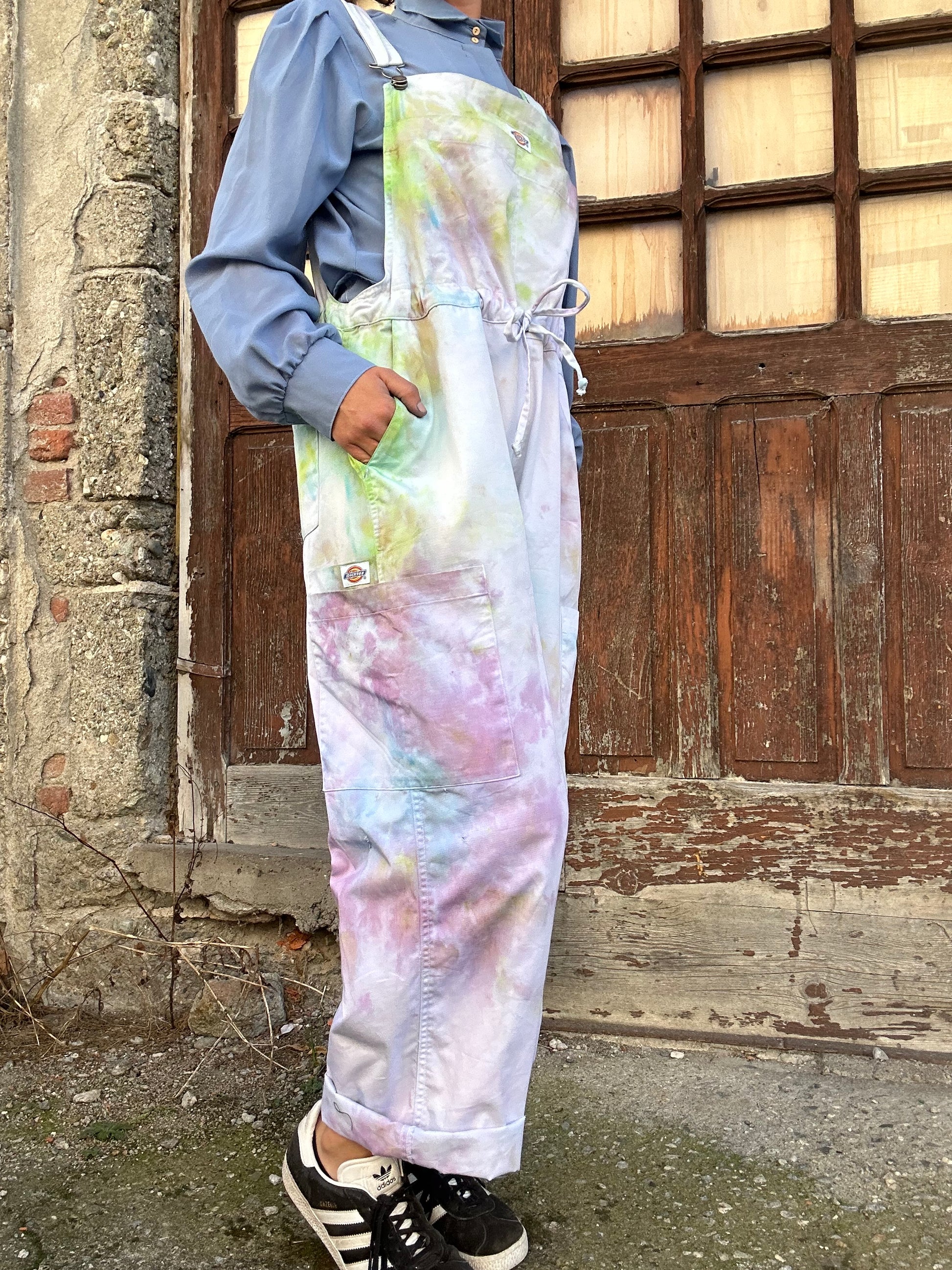 Salopette dickies customizzata con tecnica tye die colori pastello. Pezzo unico, taglia: L.