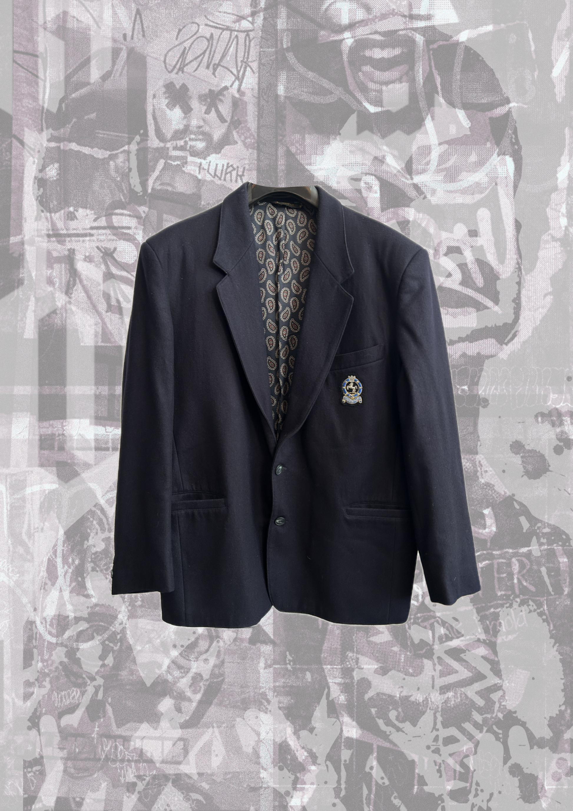 Cappotto vintage WamPum in perfette condizioni, blu scuro con fodera interna astratta. Taglia: L.