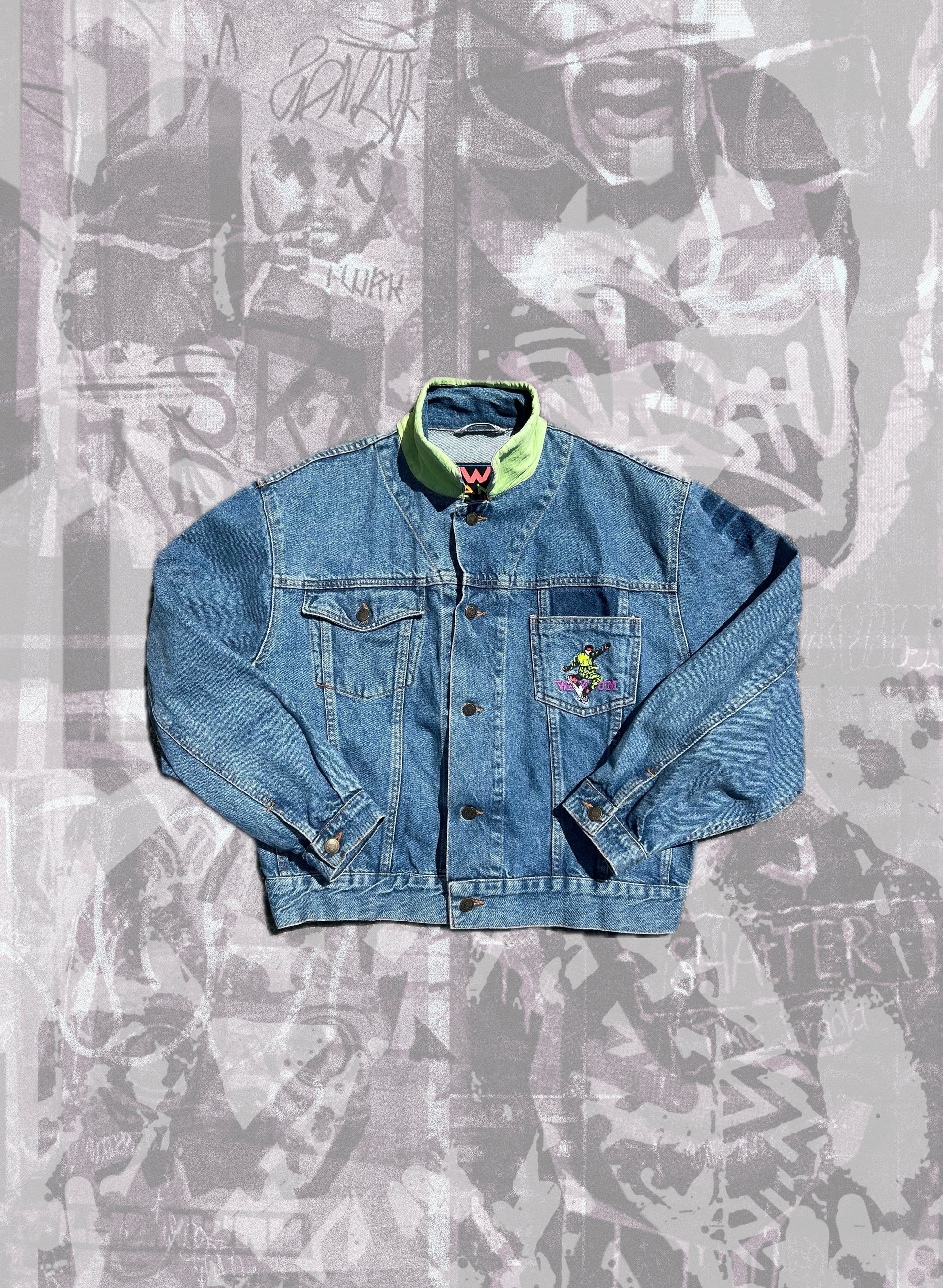 Giacca in jeans Wampum Vintage in ottime condizioni, con dettaglio skater sul petto, segno di una vecchia toppa sulla spalla sx, taglia: L, fit boxy cropped.